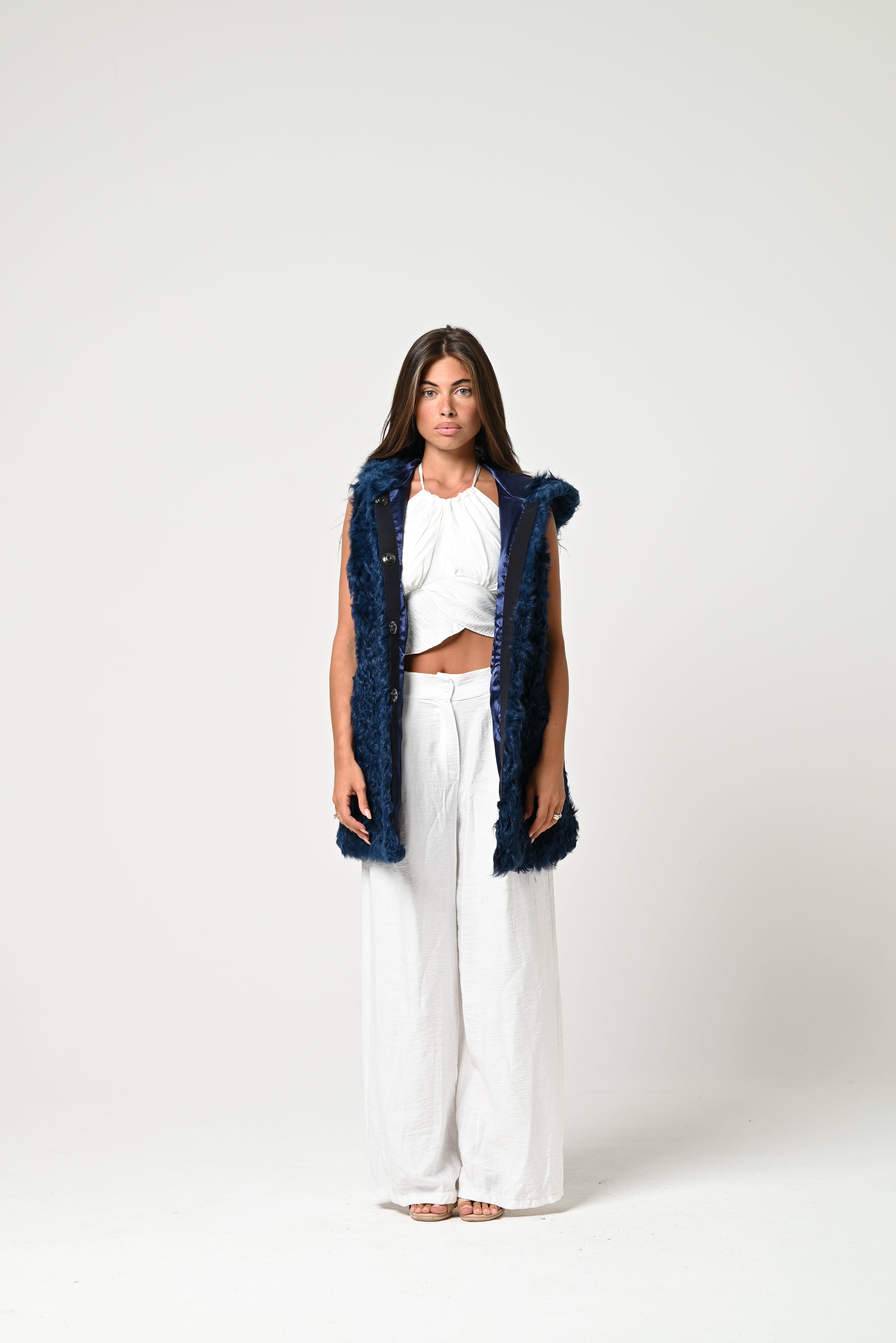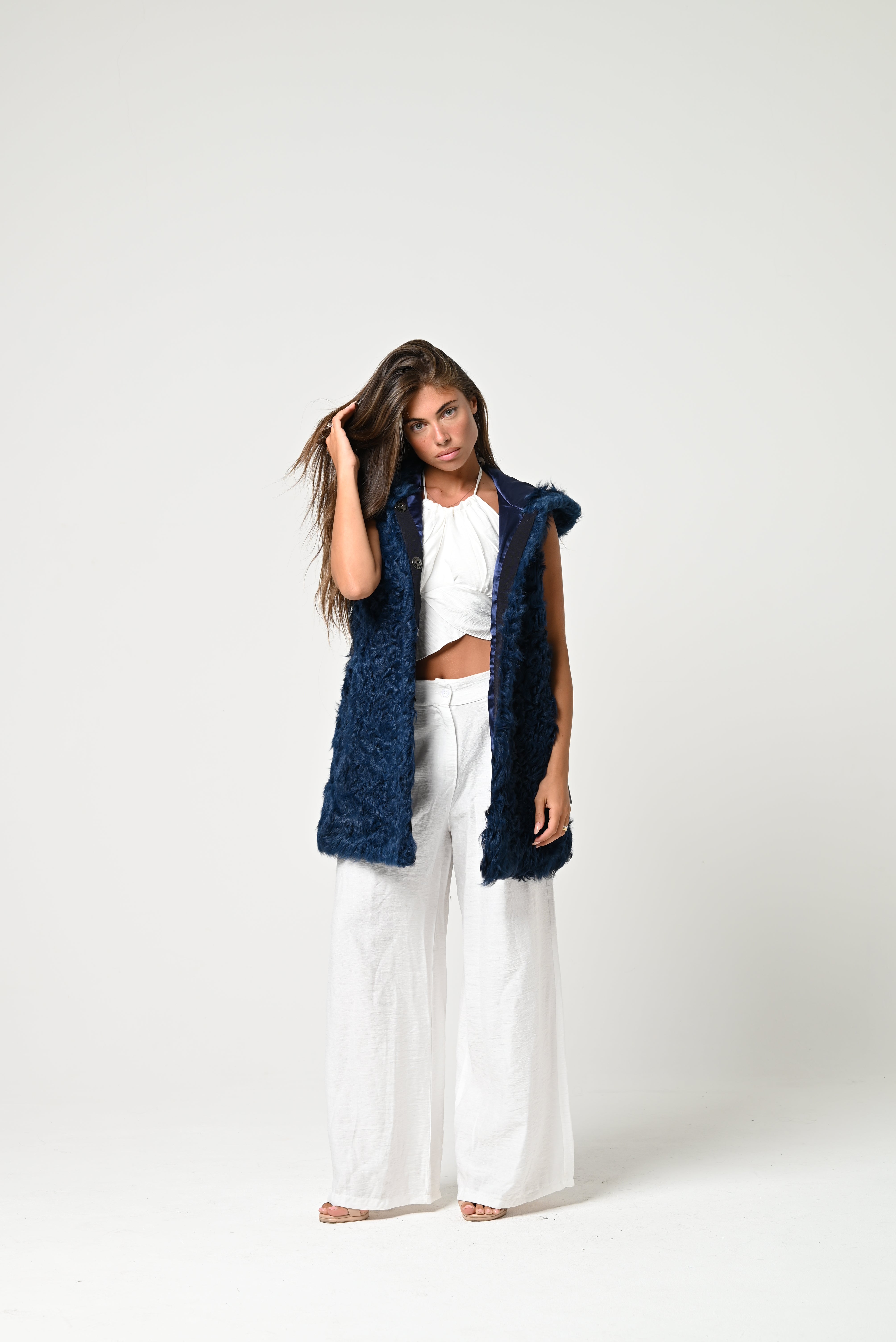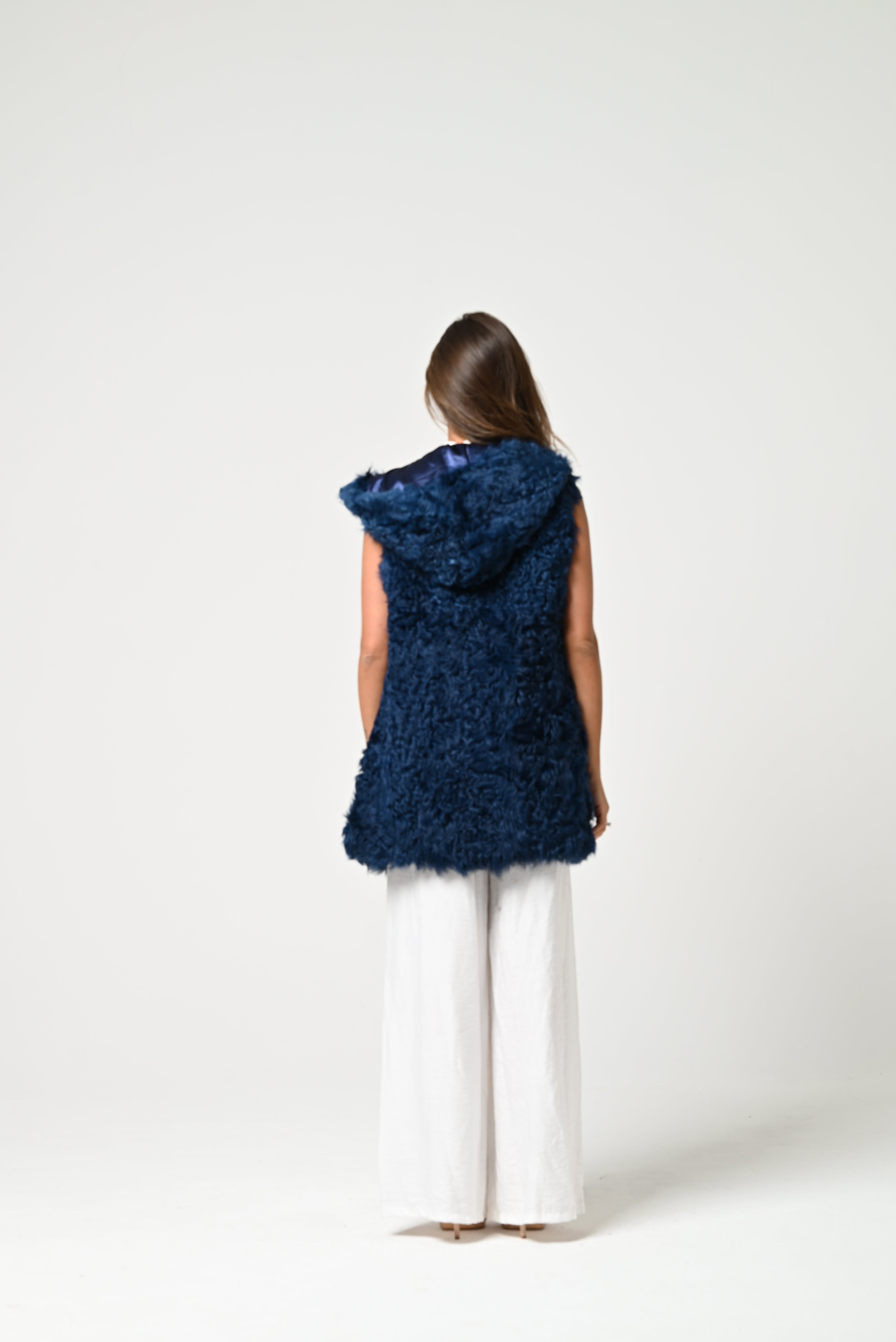 Gilet in agnello shearling senza maniche, dal taglio dritto e moderno. Realizzato in un intenso blu notte, presenta pelo riccio e morbido che dona texture e volume. Dotato di cappuccio, è un capo pratico ma raffinato, perfetto per look casual-chic con un tocco originale.