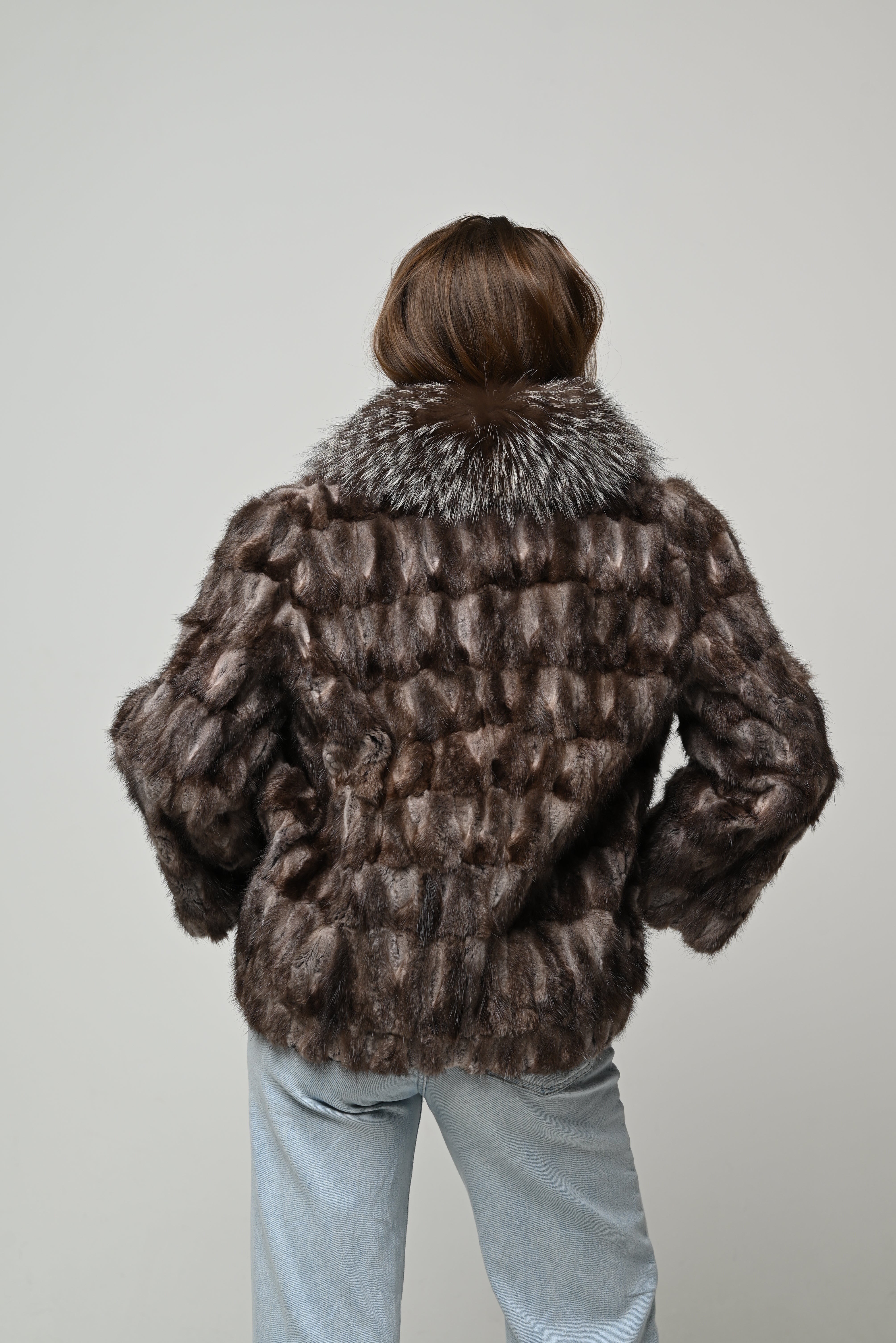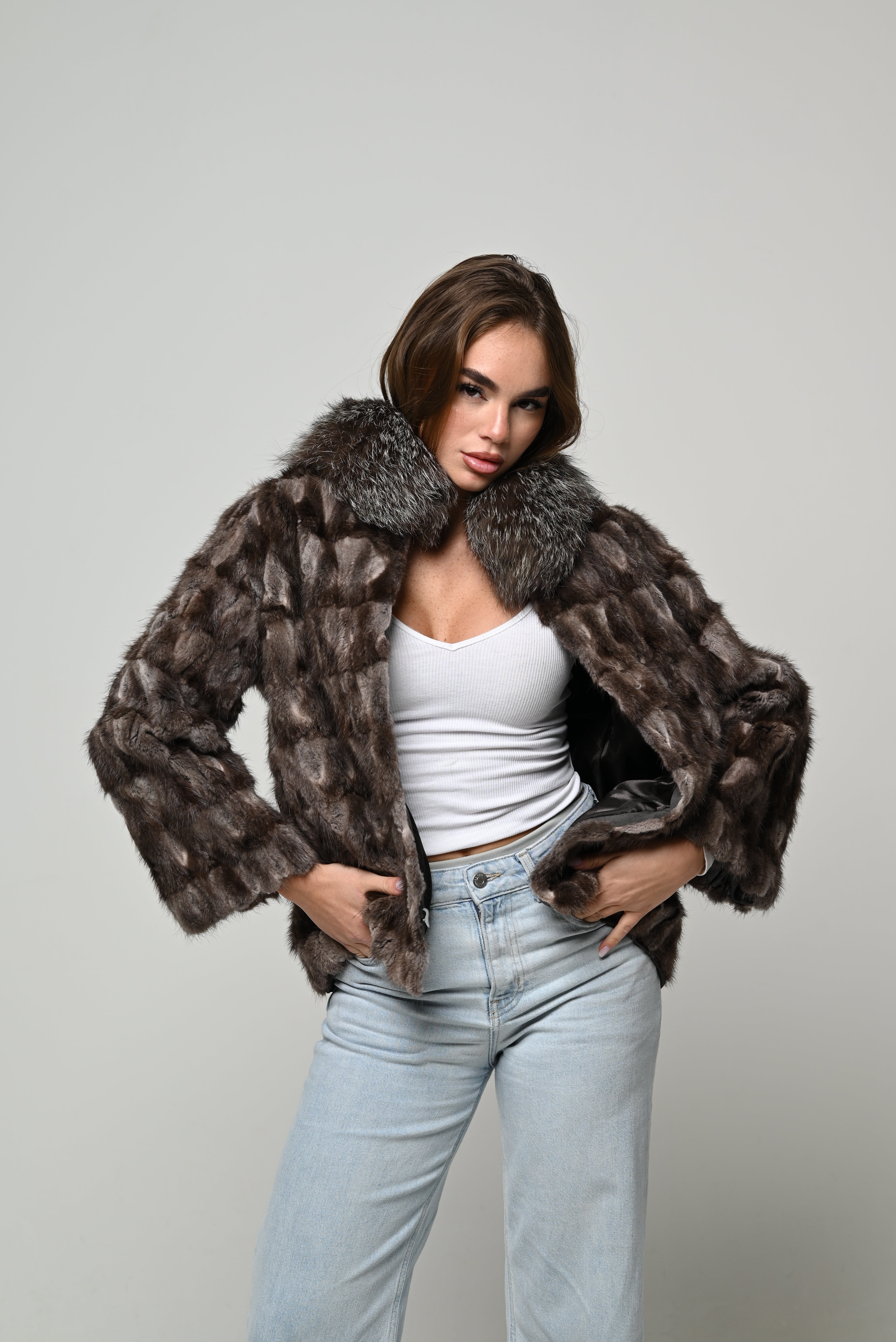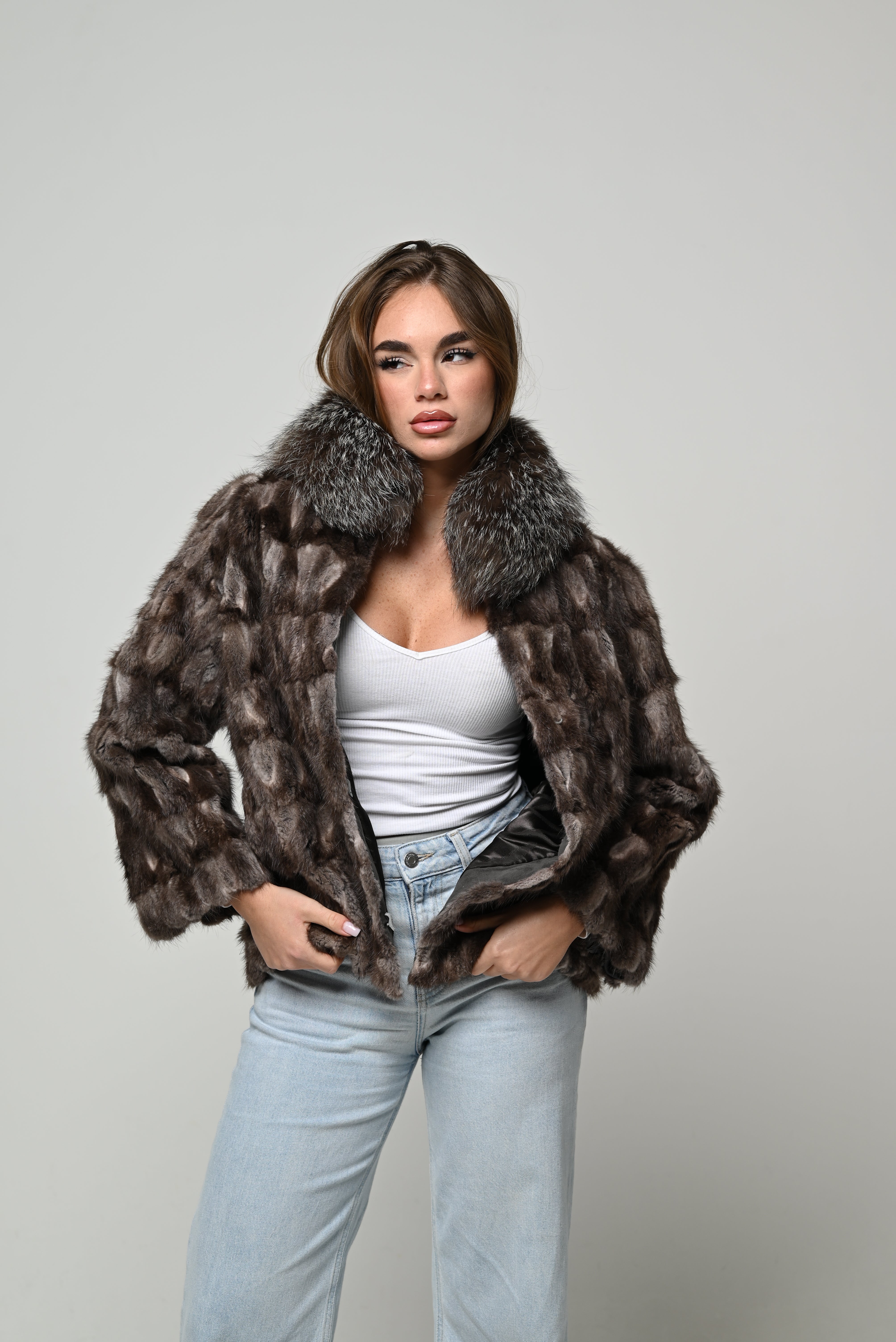 Pelliccia nuova in vera pelliccia naturale di lapin e volpe, modello corto con linea pulita e vestibilità regolare. Pelo compatto, setoso e ultra morbido, in una elegante tonalità tortora-marrone con leggere sfumature fumo che donano profondità al colore. Collo importante in pelliccia più lunga a contrasto, maniche morbide e struttura leggermente avvolgente che valorizza la silhouette. Chiusura frontale invisibile e interno foderato per un comfort ottimale.