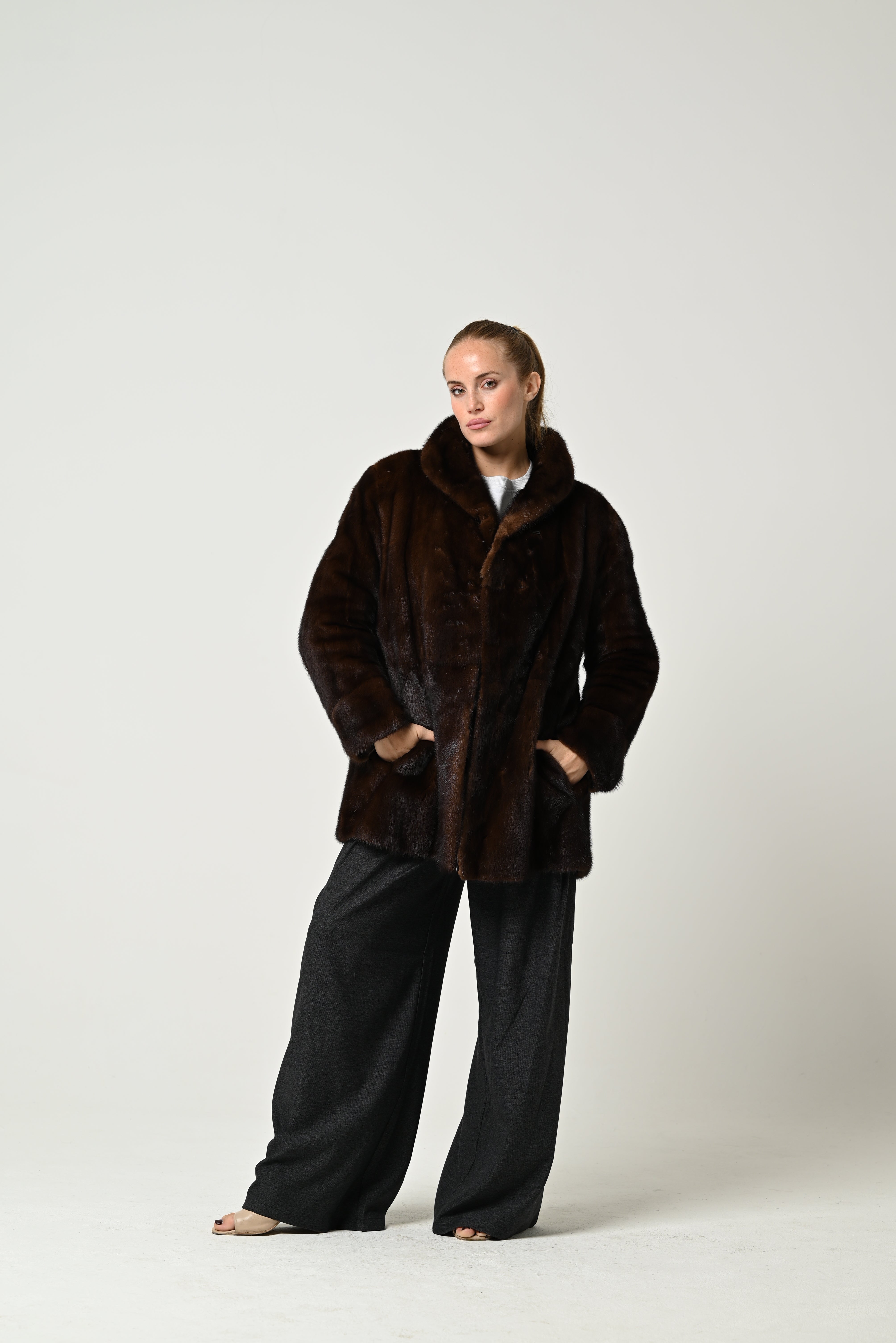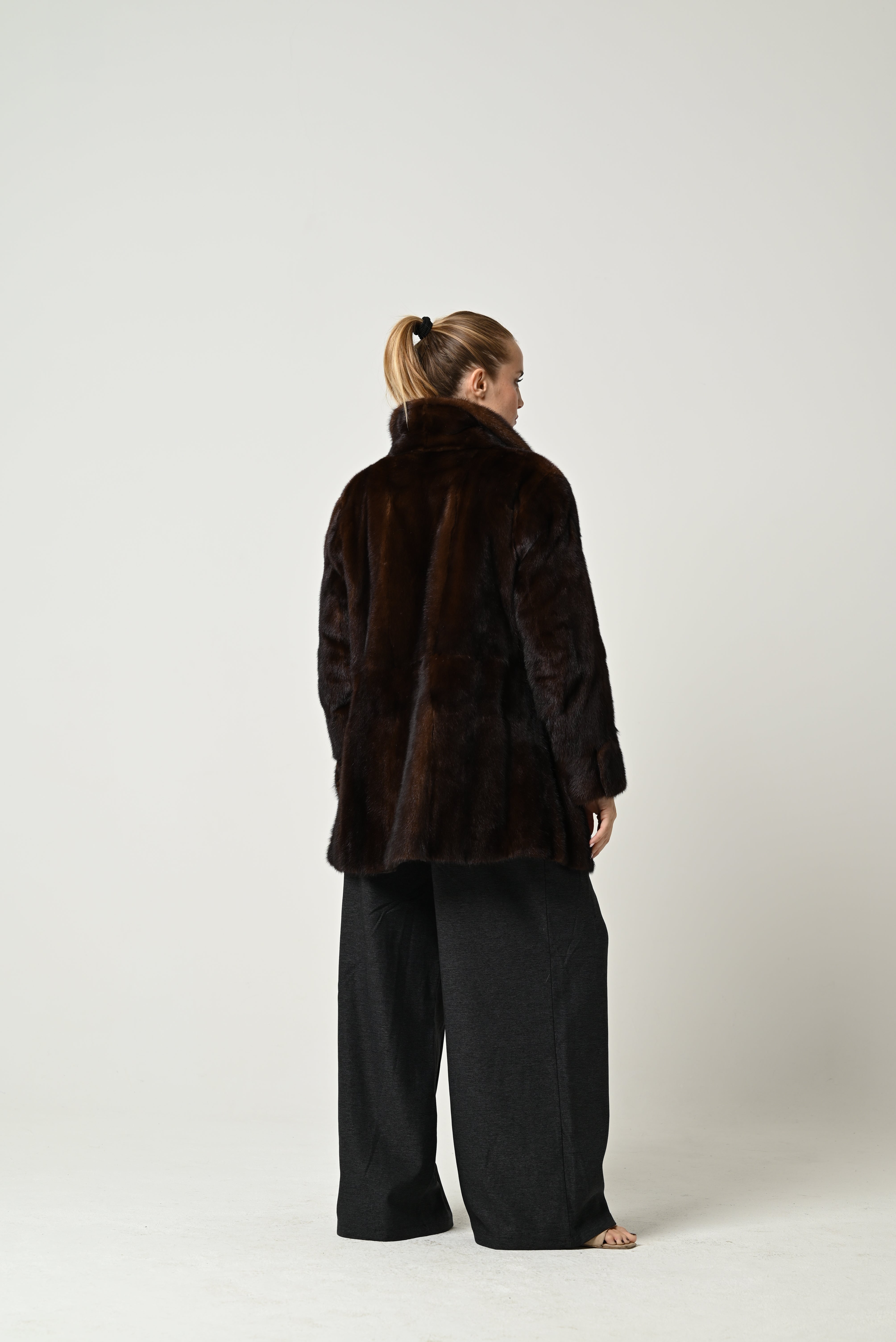 Elegante pelliccia in morbido pelo marrone scuro con taglio dritto e vestibilità confortevole. Colletto ampio e linea pulita che valorizzano la figura. Un capo raffinato e senza tempo, perfetto per aggiungere un tocco di lusso e calore ai look invernali.