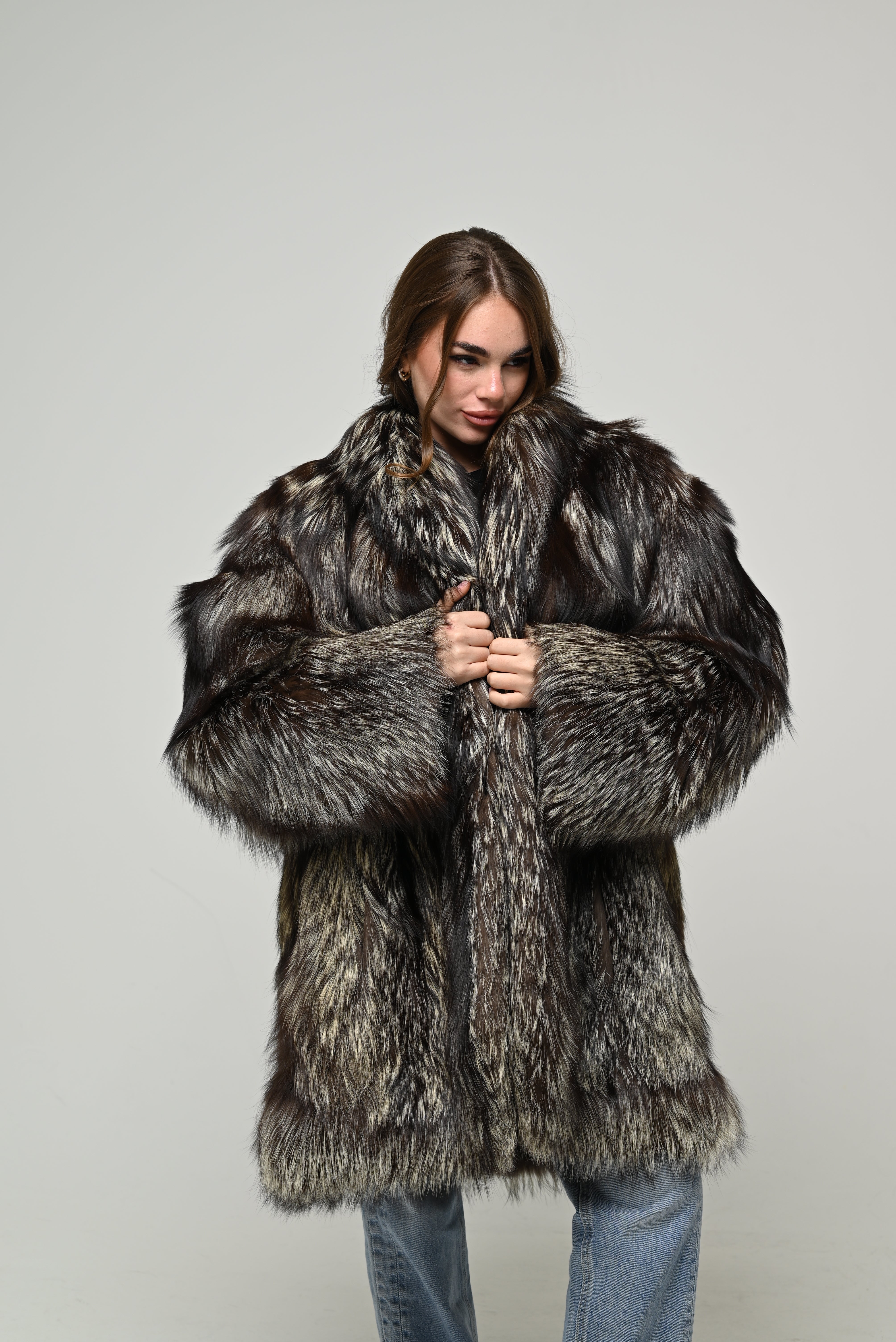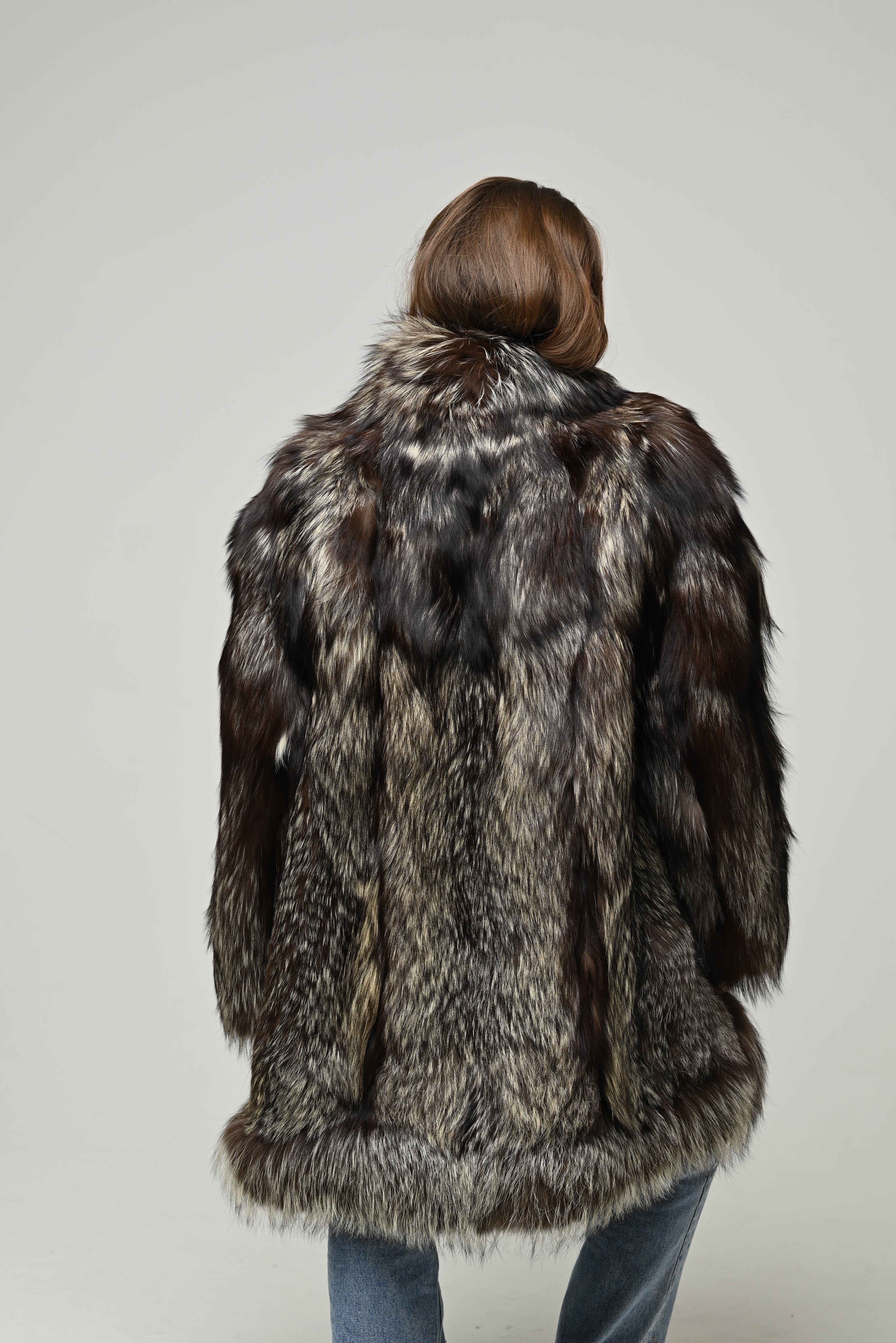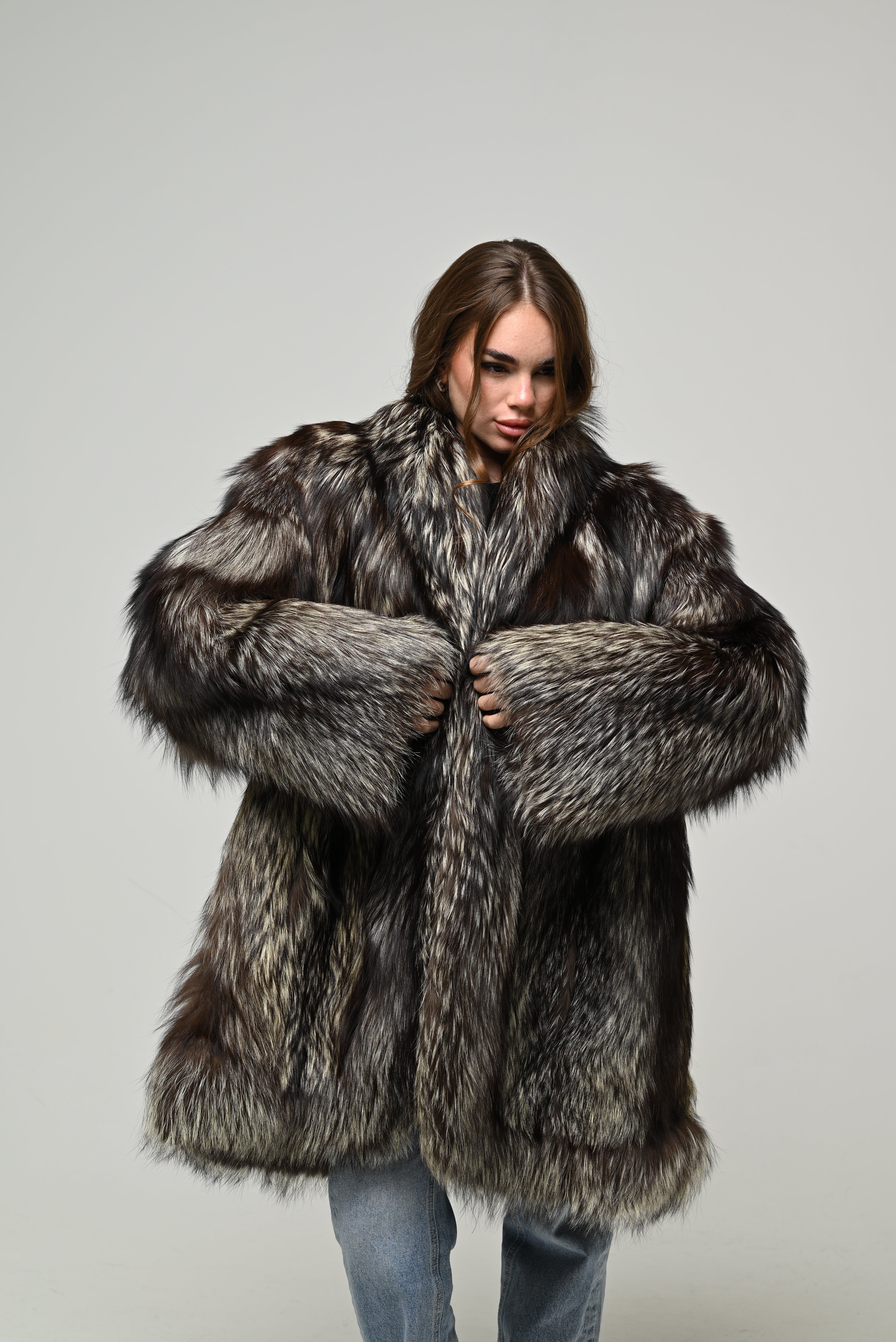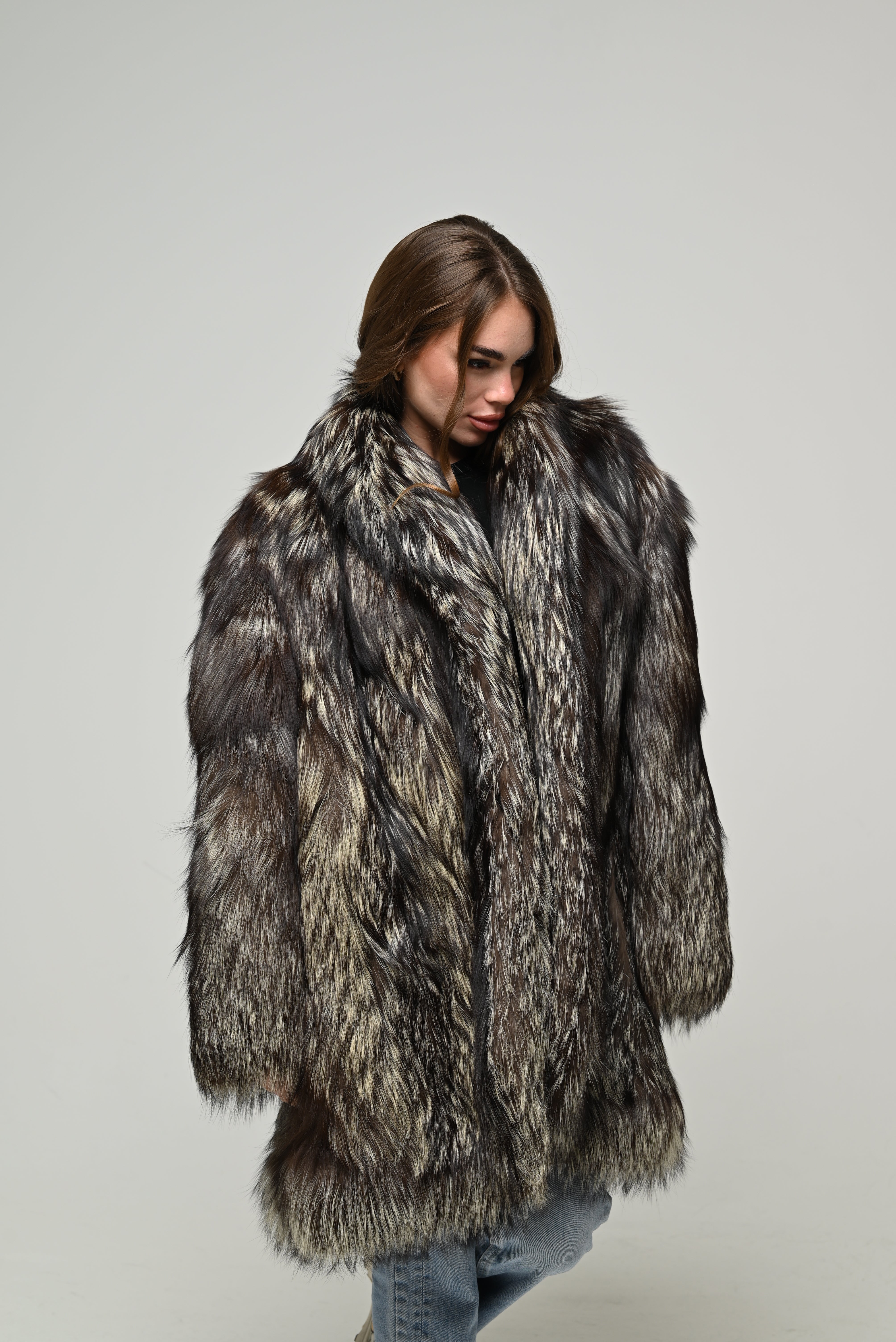 Cappotto in volpe naturale selezionata nei toni bianco panna, miele freddo e ombre argento.