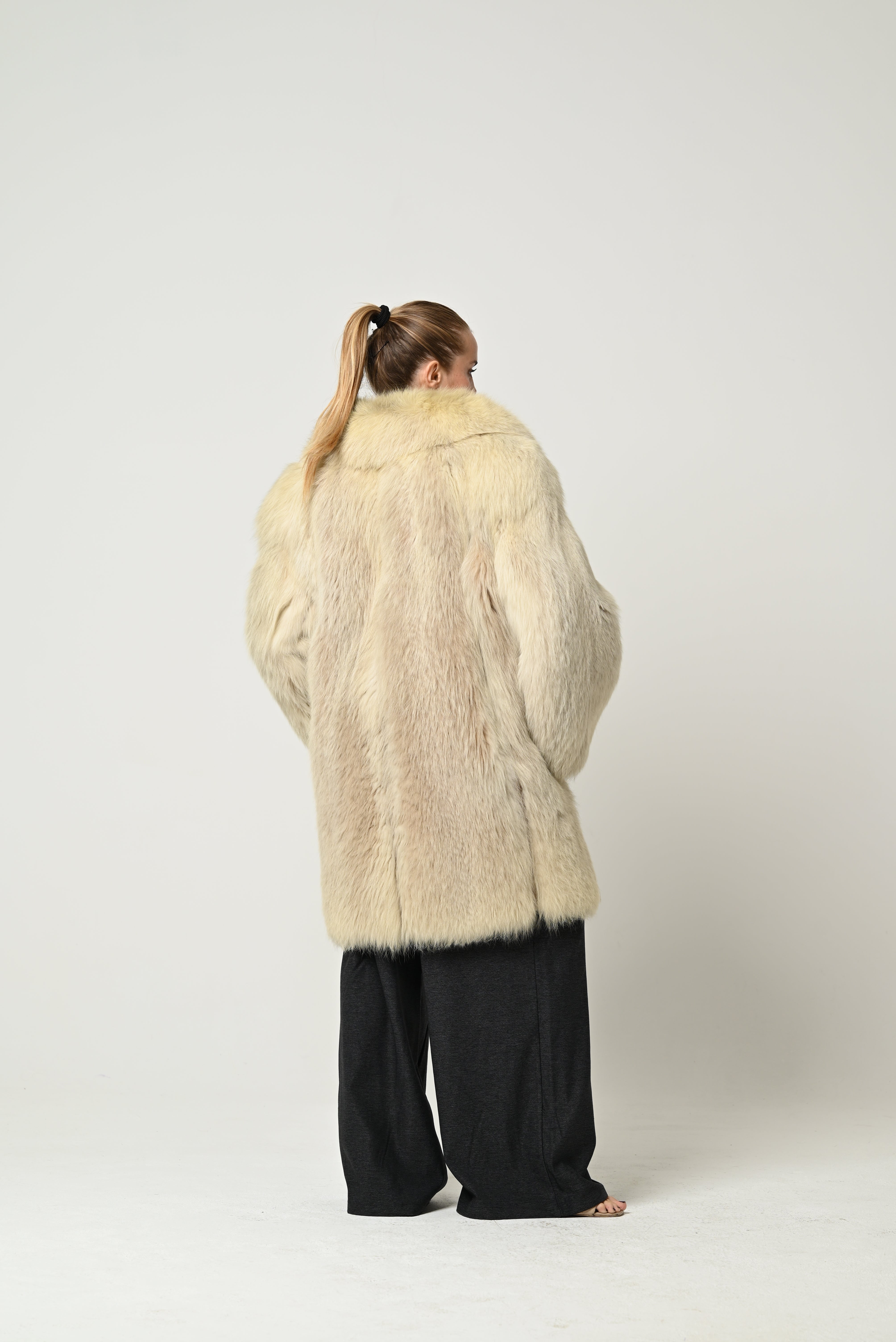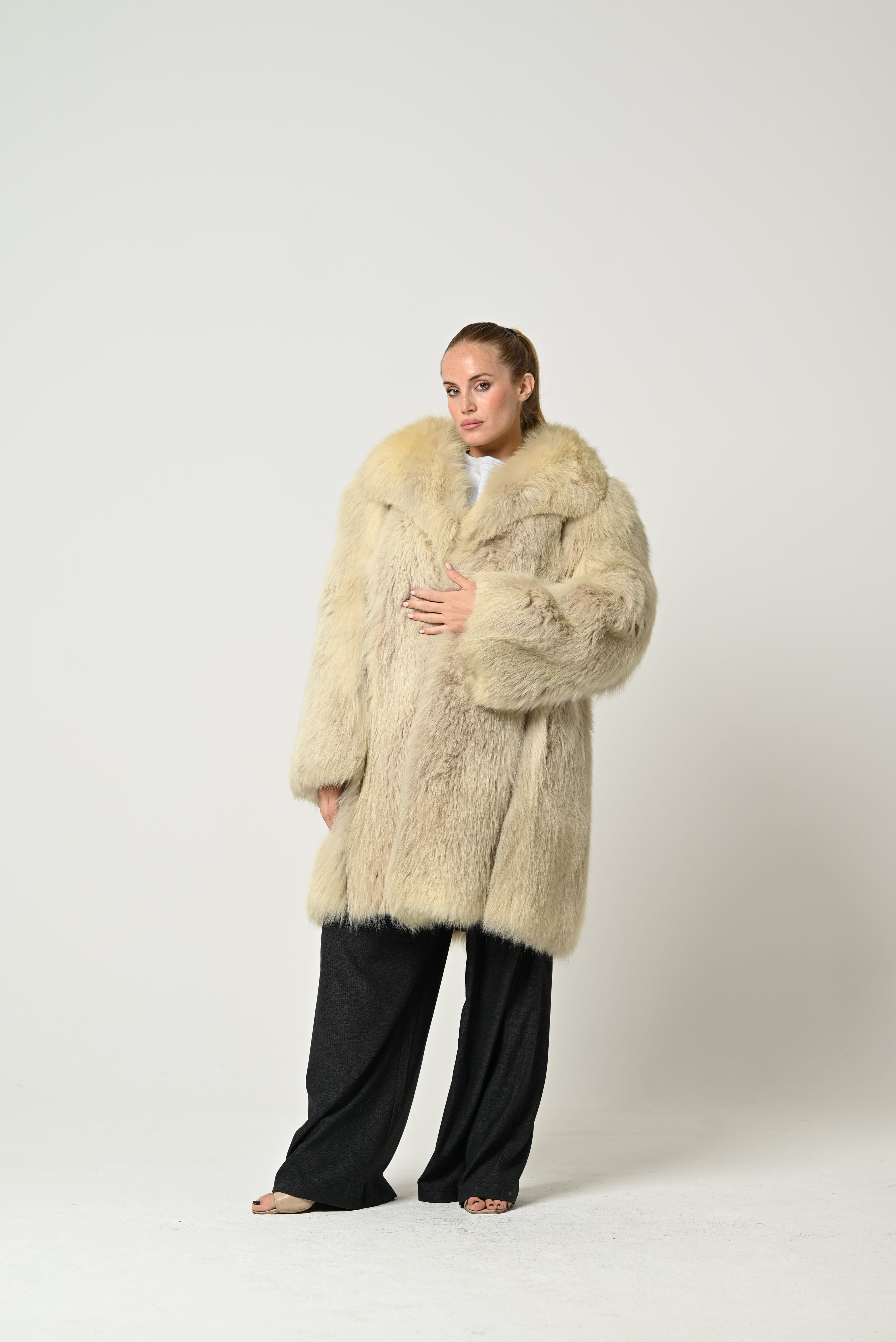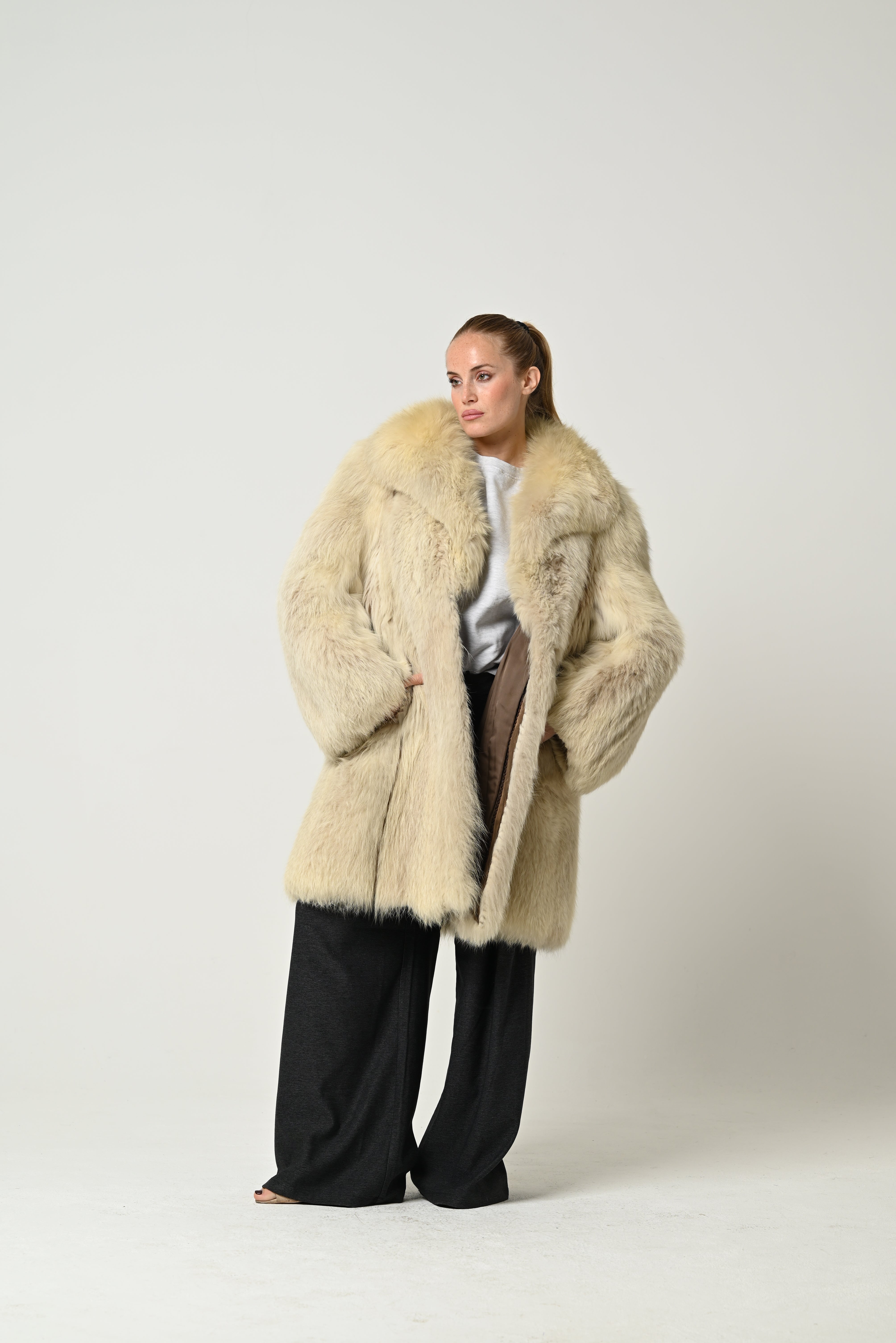 Pelliccia lunga in vera volpe, dal taglio oversize e dal volume importante. Il colore è un beige chiaro con delicate sfumature miele, che valorizza la naturale lucentezza del pelo. Il colletto ampio e avvolgente incornicia elegantemente il viso, mentre le maniche morbide e ampie aggiungono movimento e prestigio al capo. Interno foderato per un comfort impeccabile e una vestibilità calda e lussuosa.