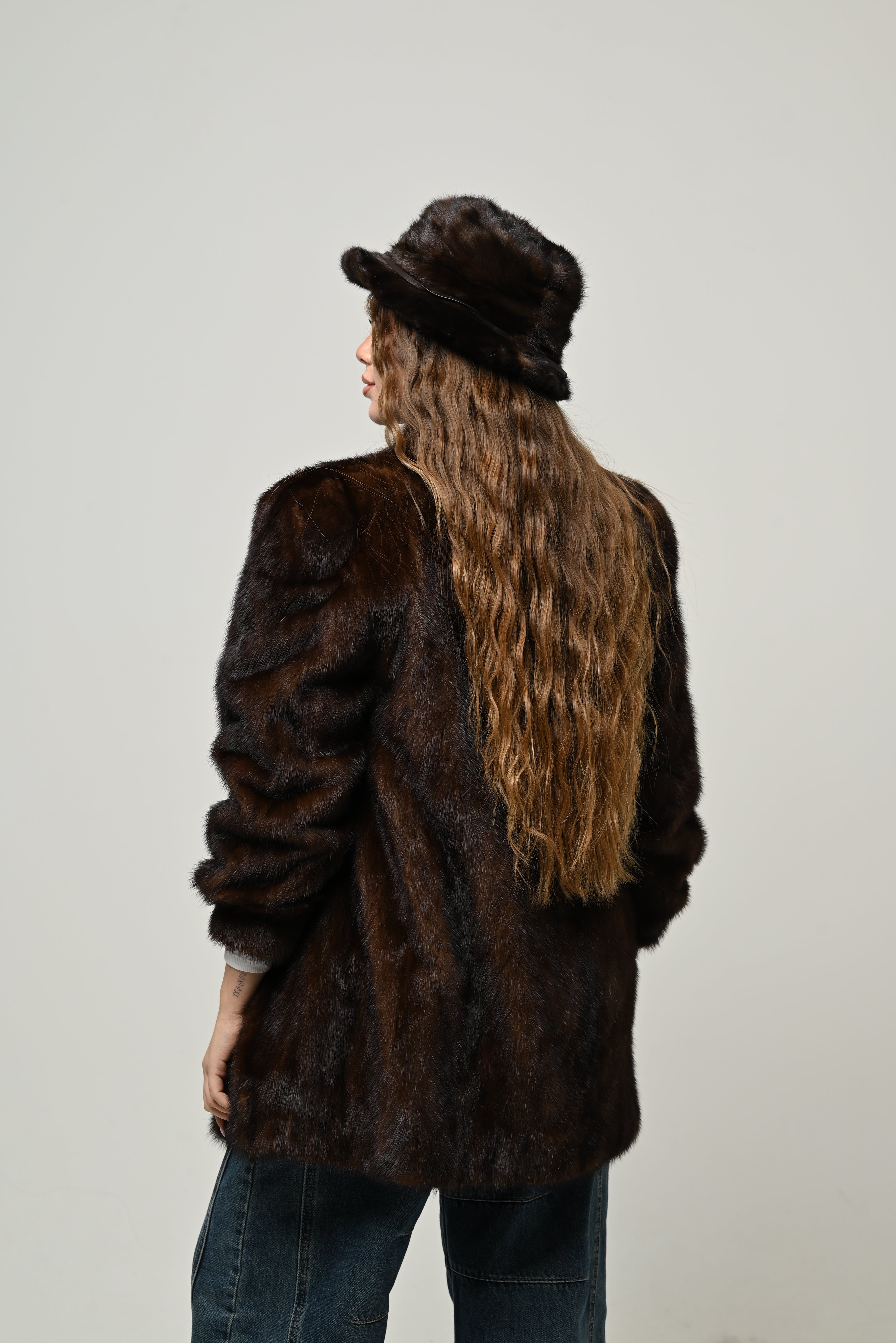 è una pelliccia dal colore marrone scuro ricco e uniforme, con una lucentezza elegante tipica del visone di alta qualità. Il pelo è liscio, compatto e molto morbido al tatto, con leggere sfumature che donano profondità al capo.