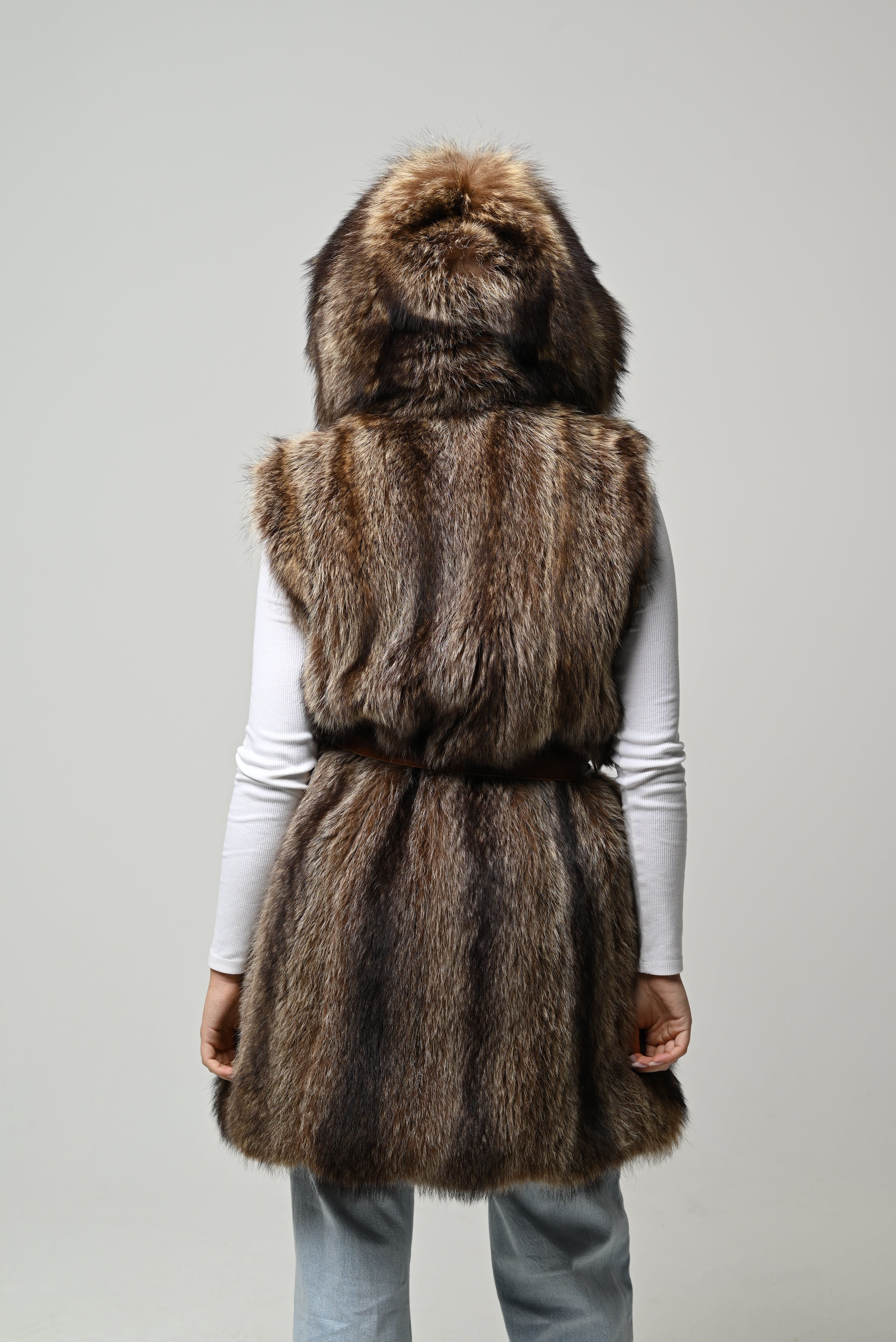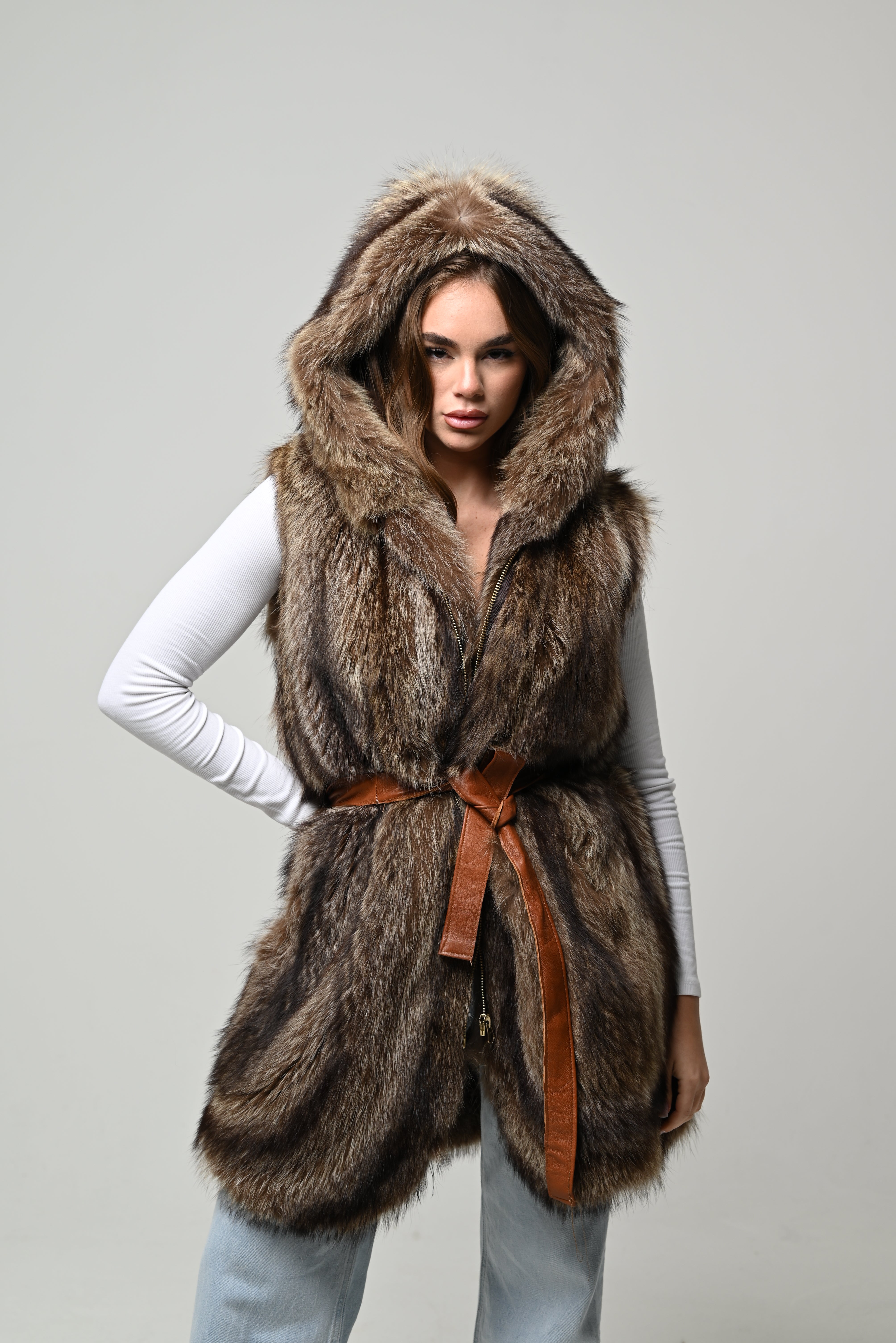 Gilet in pelliccia con cappuccio, caratterizzato da tonalità naturali marrone caldo con leggere sfumature più chiare. Modello smanicato con chiusura frontale e cintura in vita che valorizza la silhouette. Vestibilità morbida ma regolabile grazie alla cintura, ideale sia aperto che chiuso. Capo caldo, elegante e versatile, perfetto per completare look casual o più ricercati.