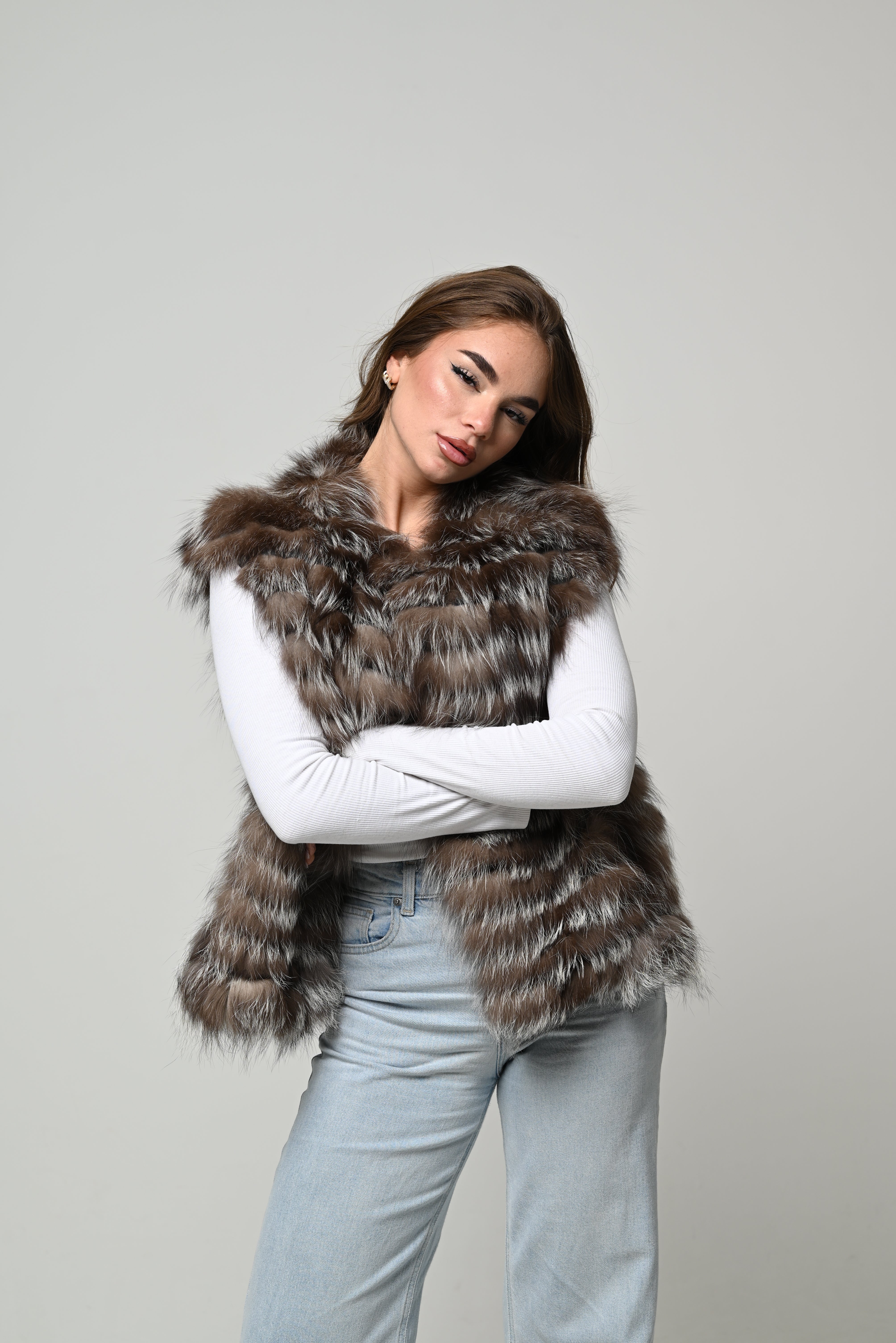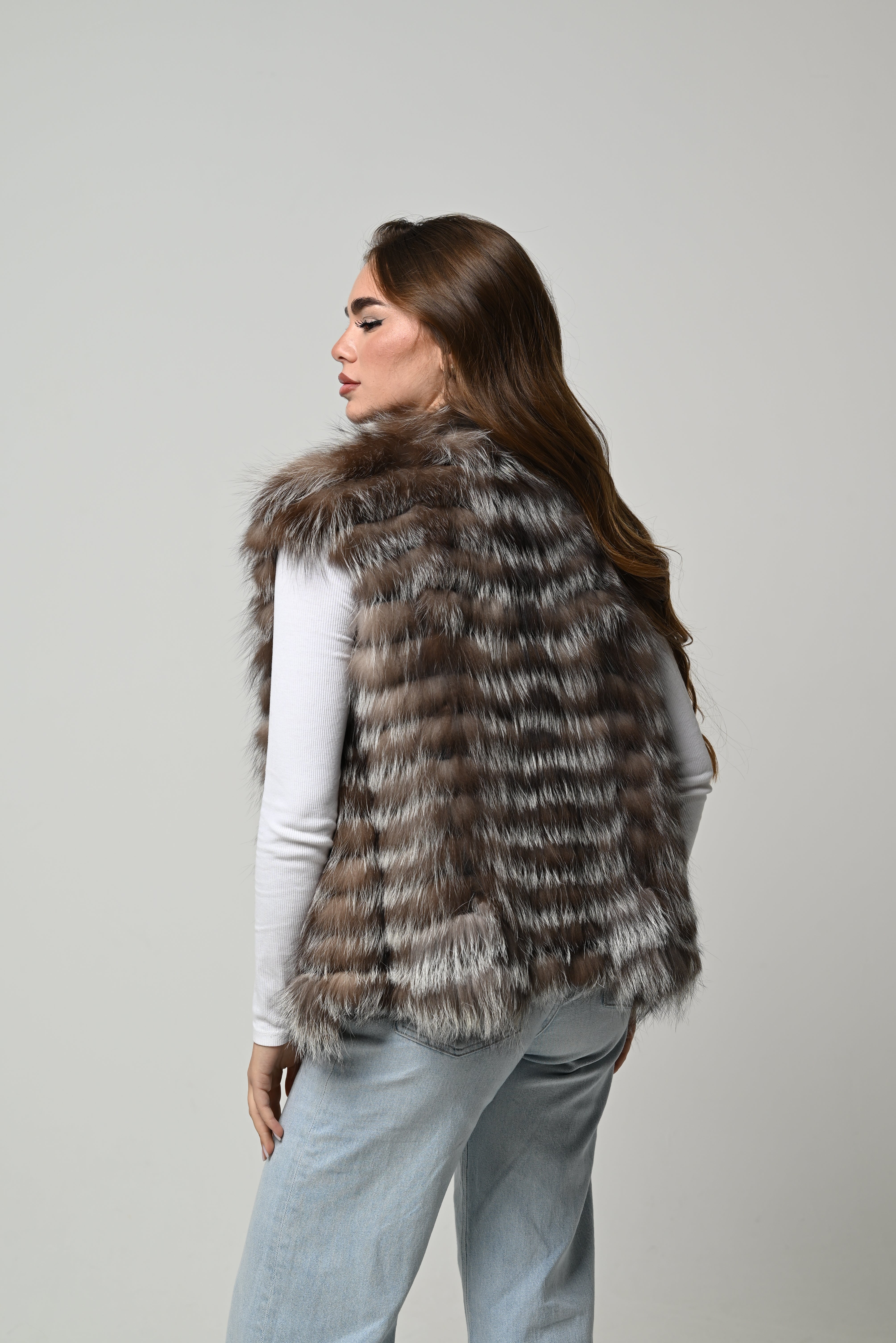Pelliccia nuova in vera pelliccia naturale di volpe, modello smanicato con linea pulita e vestibilità regolare. Pelo lungo, pieno e ultra soffice, caratterizzato da eleganti sfumature nei toni del marrone, nocciola e grigio che donano profondità e luminosità al capo. Lavorazione a fasce orizzontali per un volume armonioso, spalle morbide e scollo aperto che valorizzano la silhouette in chiave moderna e femminile. Interno foderato per un comfort ottimale.