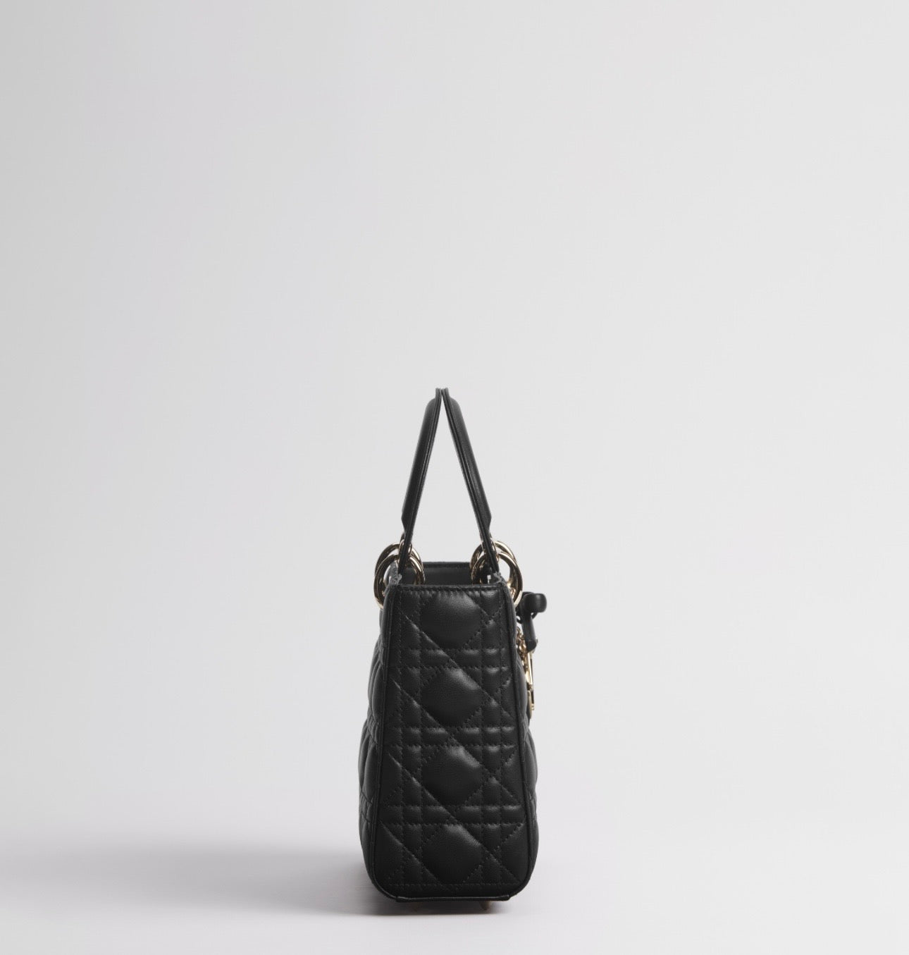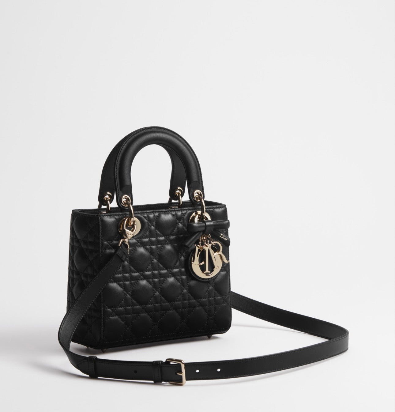 . Con manici rigidi. Classica cucitura Cannage con effetto trapuntato. Con hardware in metallo oro pallido. Ciondoli D.I.O.R. in metallo. Tracolla removibile e regolabile completamdi charm. Con piedini. Tasca interna con cerniera. Chiusura con pattina.