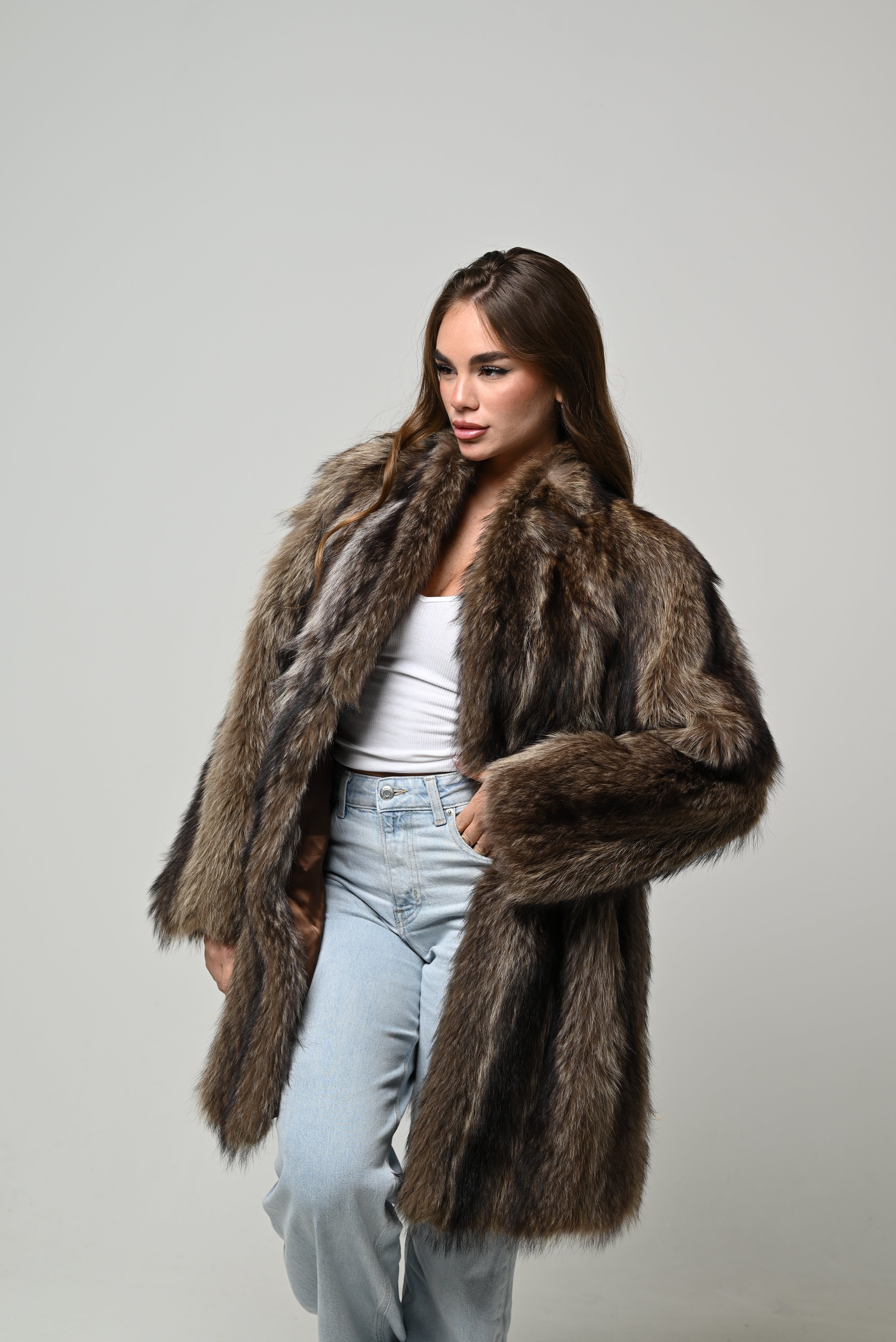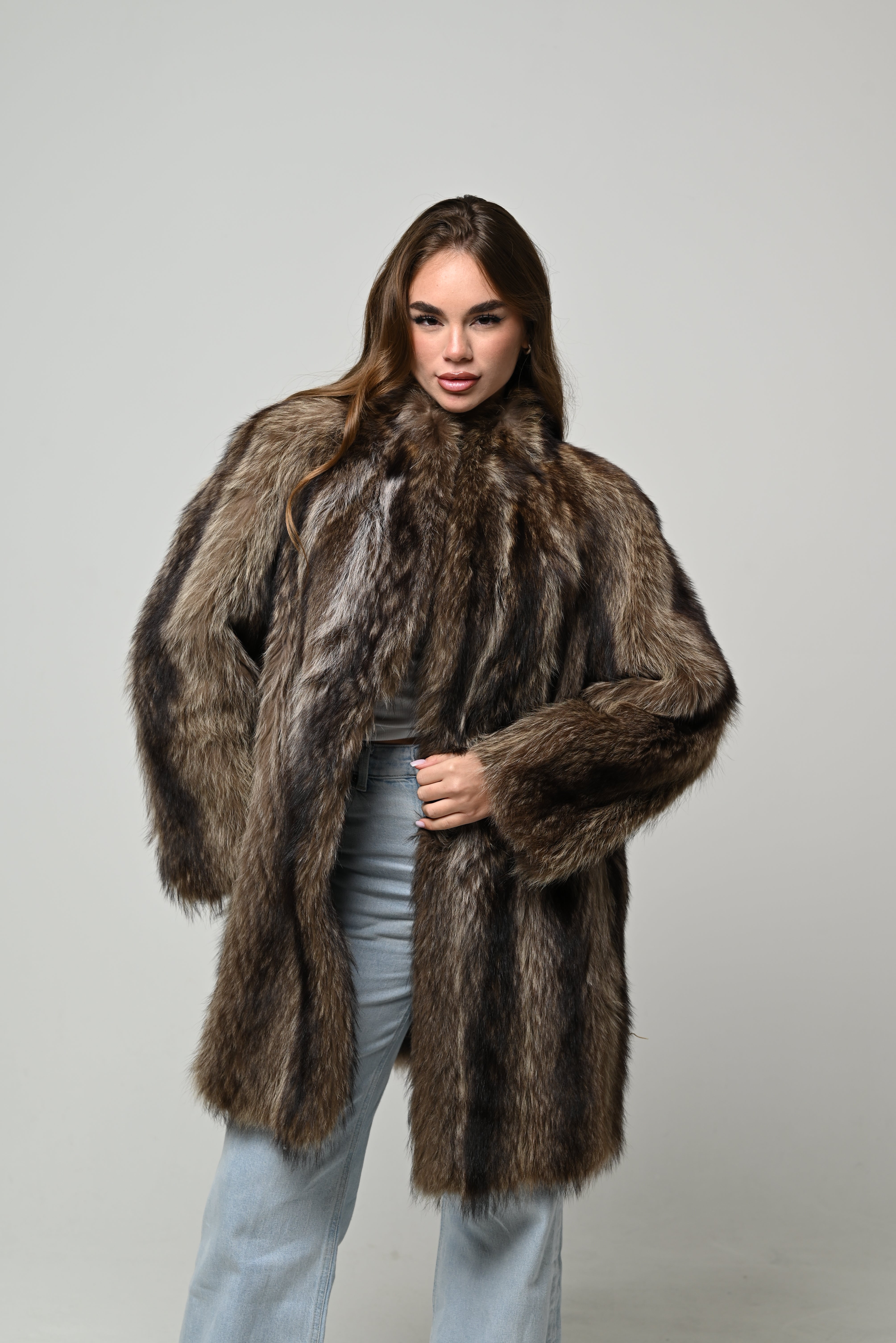 Pelliccia vintage in vera pelliccia naturale di marmotta, modello medio con linea pulita e vestibilità morbida. Pelo lungo, pieno e ultra soffice, con sfumature naturali nei toni del marrone caldo e nocciola che donano profondità al colore e rendono il capo estremamente elegante e versatile. Lavorazione a fasce verticali che slancia la figura, con collo morbido e maniche ampie per un fit avvolgente e raffinato. Chiusura frontale invisibile e interno foderato per maggiore comfort. Range taglie consigliato: dalla 40 alla 44