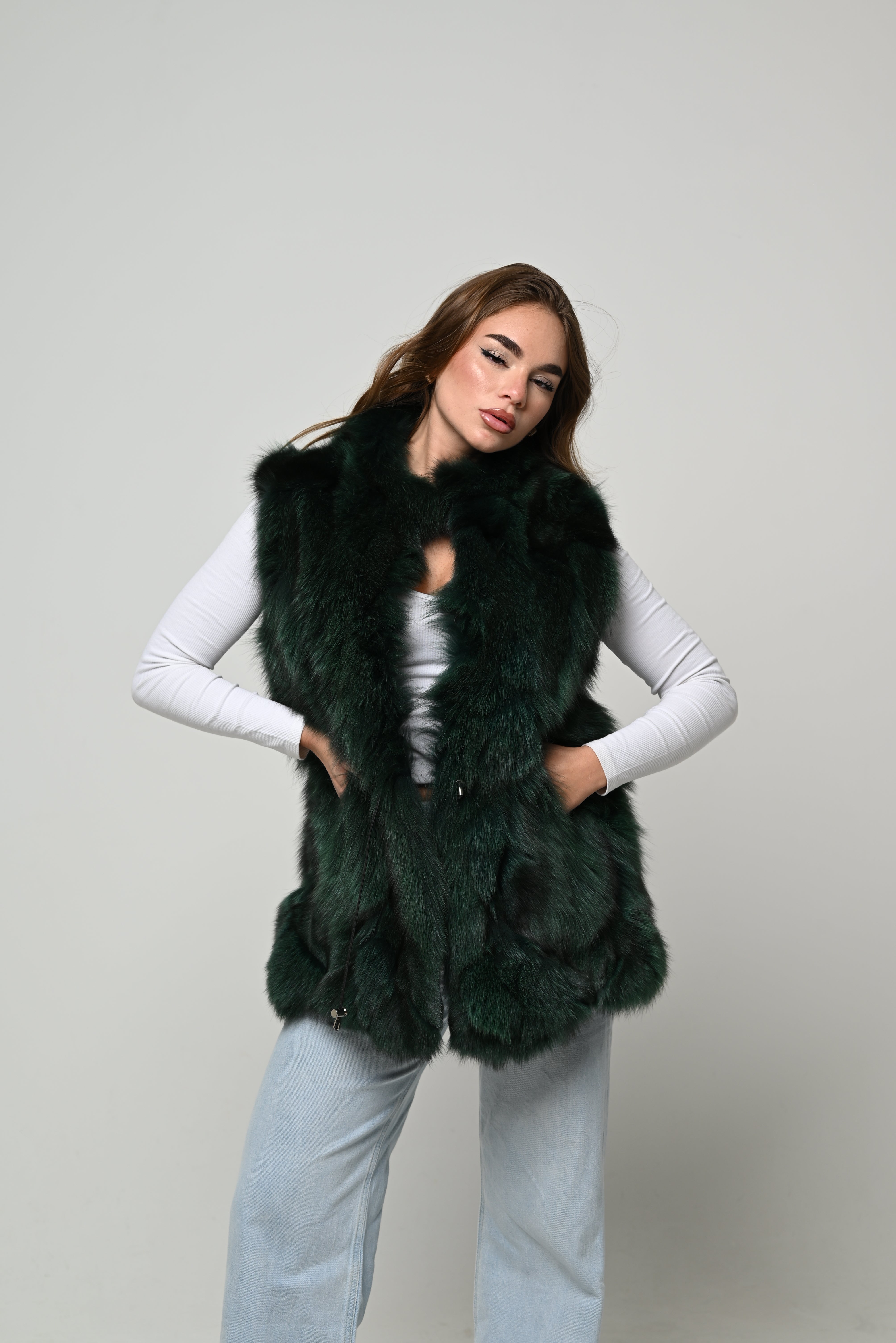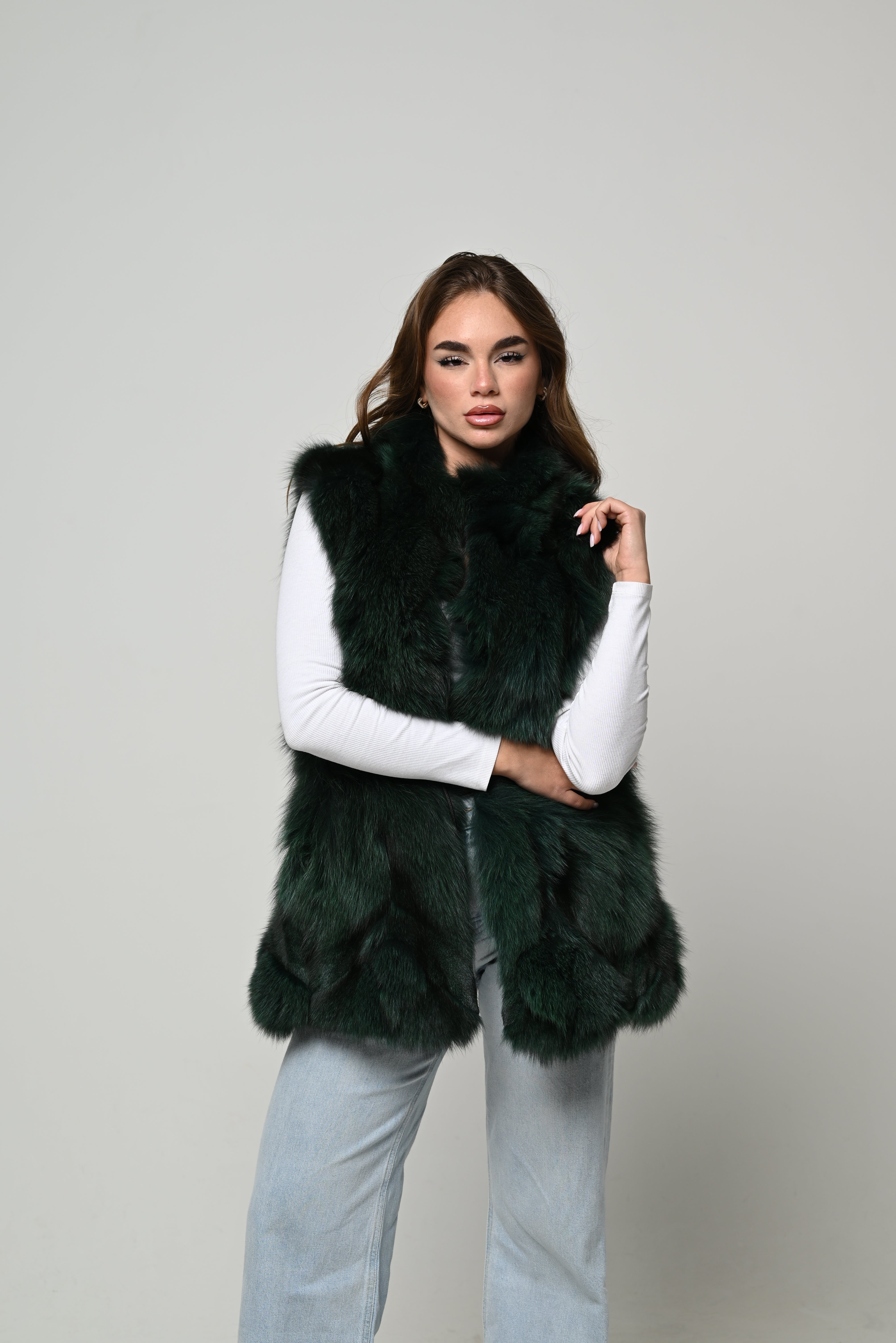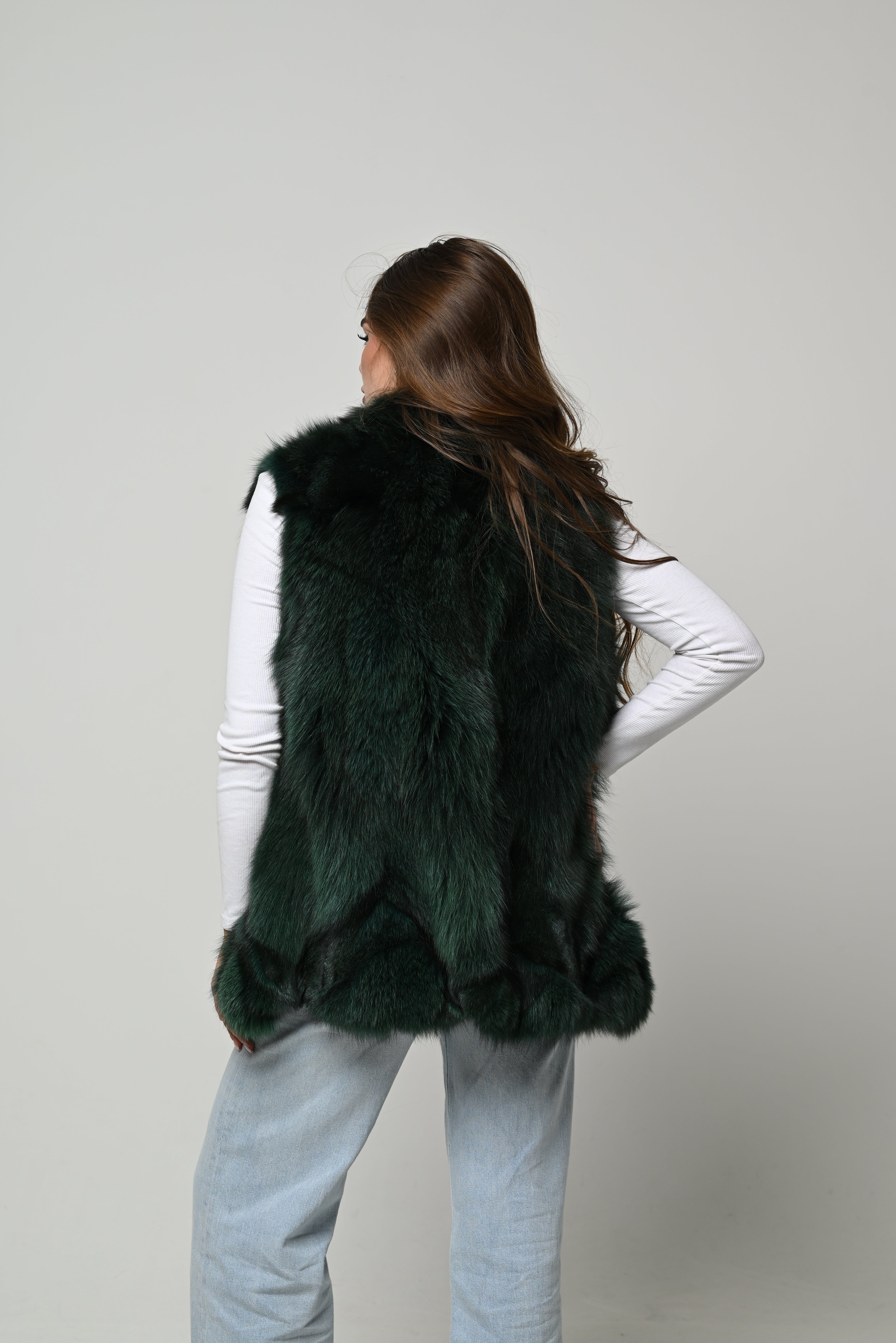 Gilet nuovo in vera pelliccia naturale di volpe, modello medio-lungo con linea leggermente svasata e vestibilità regolare. Pelo lungo, pieno e ultra soffice, in una profonda tonalità verde bosco con leggere sfumature scure che donano intensità e movimento al colore. Scollo aperto, struttura morbida sulle spalle e lavorazione a fasce che slancia la figura. Chiusura frontale invisibile e interno foderato per un comfort ottimale.