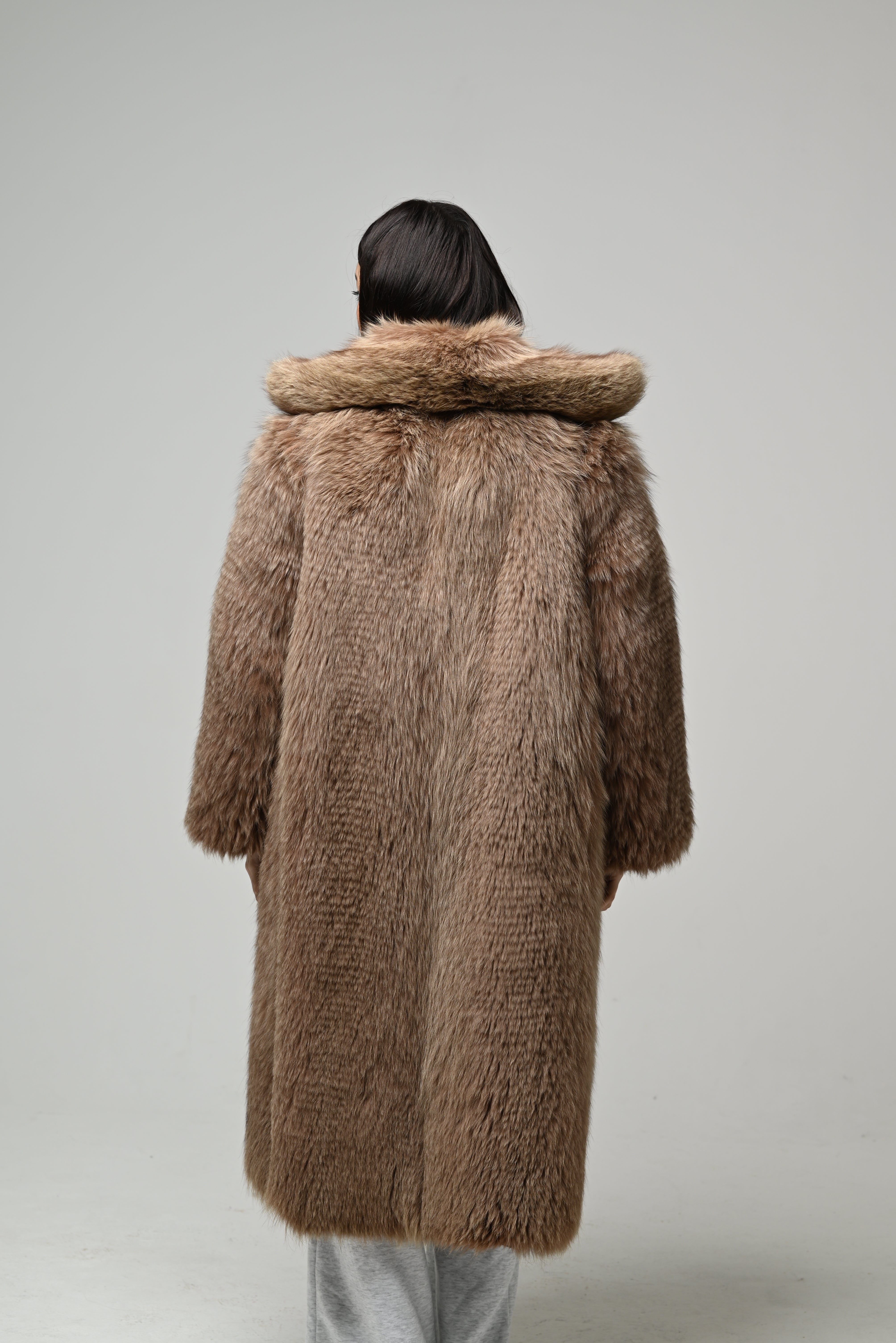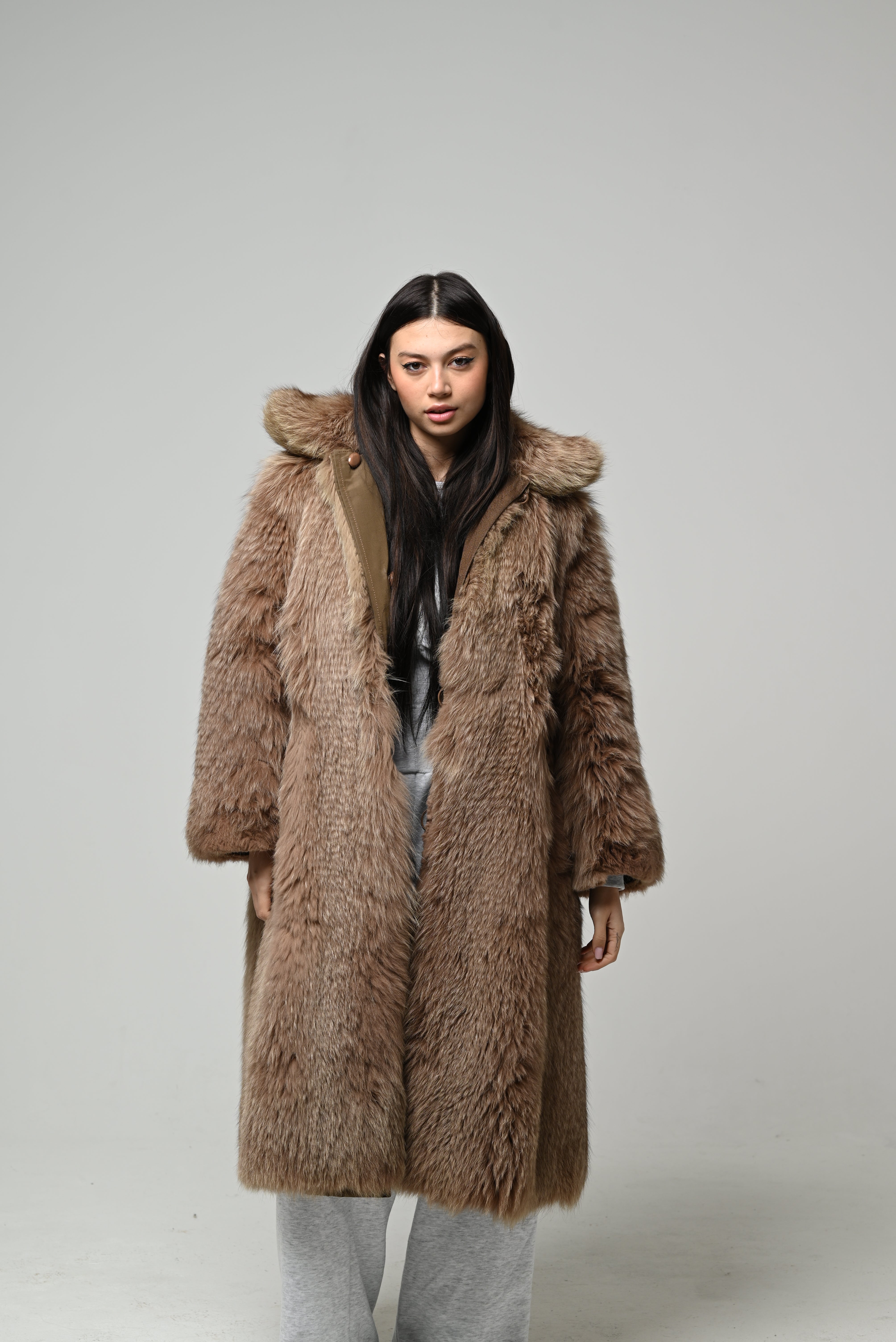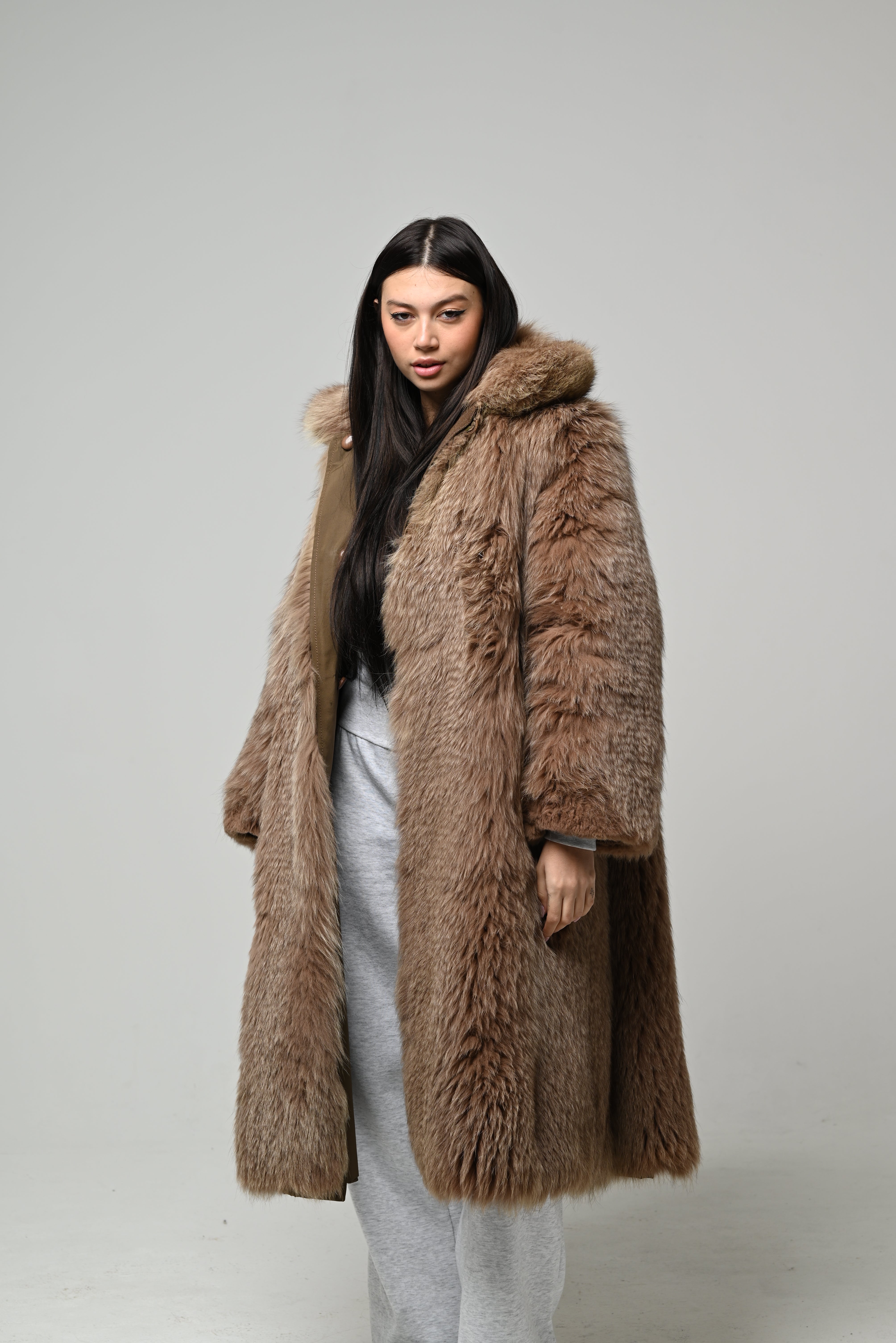 Pelliccia nuova in vera pelliccia naturale, modello lungo dalla linea morbida e avvolgente con vestibilità regolare. Il pelo è fitto, soffice e voluminoso, in una elegante tonalità marrone caldo con leggere sfumature nocciola che valorizzano il colore naturale della pelliccia.